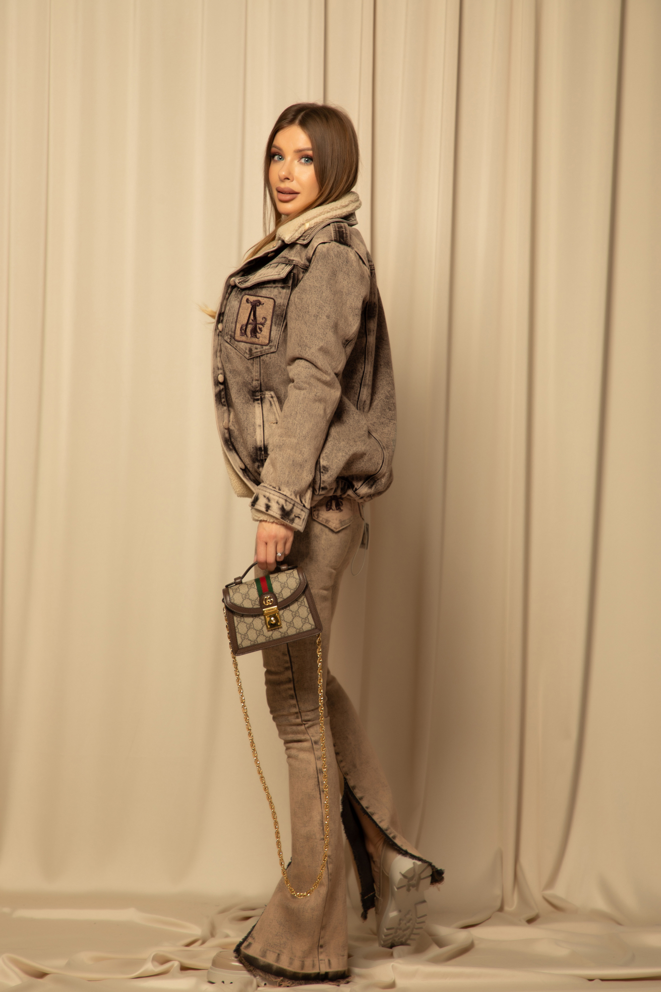 • Material: denim (bumbac), textile (bumbac), cărăcul